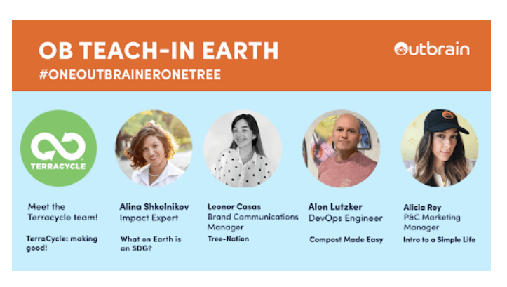 En honor al Día de la Tierra, Outbrain está llevando a cabo sesiones OB Teach-In Earth para los empleados. TerraCycle vendrá a compartir su visión sobre el tema medioambiental, Leonor Casas de Tree-Nation, así como Alina Shkolnikov, experta en impacto, para enseñarnos más sobre los ODS (Objetivos de Desarrollo Sostenible). Además, estamos llevando a cabo varias sesiones con el equipo para aprender los unos de los otros y ampliar nuestras herramientas.
