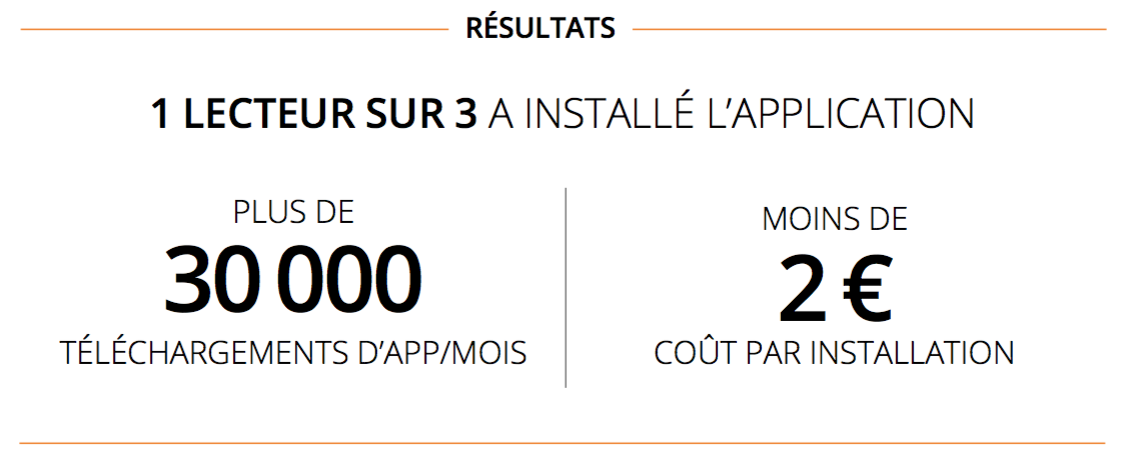 Grâce à sa stratégie, 8fit est parvenu à attirer des utilisateurs potentiels sur son magazine online, puis sur son application. Des call-to-actions spécifiques ont été intégrés sur l’ensemble des contenus pour inviter les lecteurs à installer l’application et à souscrire au programme d’entraînement personnalisé. En utilisant Outbrain, 8fit a pu distribuer ses contenus auprès de mobinautes intéressés par les thématiques développées par l’entreprise. La campagne a fait l’objet de plusieurs optimisations pour convertir l’installation de l’application en inscription.