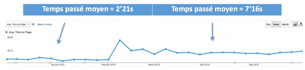 Le temps passé moyen est passé de 2,21 minutes à 7,16 minutes… Plutôt significatif non ? Nous avons désormais une réelle compréhension de ce qui intéresse vraiment notre audience, en se basant sur un critère objectif.