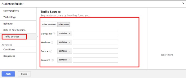 a. Create the audience. Go to your GA account>Admin> Property>Audience definitions>New audience>Traffic sources. You can choose to create audiences by the utm medium, source, campaign – separately or all together, depending on your scale in the Outbrain network.