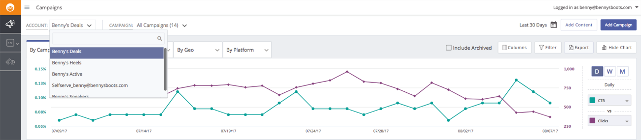 マーケティング担当者はダッシュボードの「キャンペーン」ビューを大半の時間閲覧しています。キャンペーンの管理と最適化を目指し、ダッシュボードを最大限に活用するために、ナビゲーションバーを右側に移動しました。キャンペーンデータを表示する縦軸のスペースが23%増加し、使用していないときは非表示に出来ます。