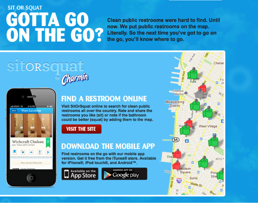 愛くるしい熊のコマーシャルで知られるトイレットペーパーの会社、Charmin。2014年は‘Sit or Squat’(座るかしゃがむか)というぴったりな(ぴったりでない?)ネーミングのモバイルアプリを作りました。これは外出先で公衆トイレが探せるというものです。アプリに加え、ユーザーがアクセスできるサイトも用意しました。