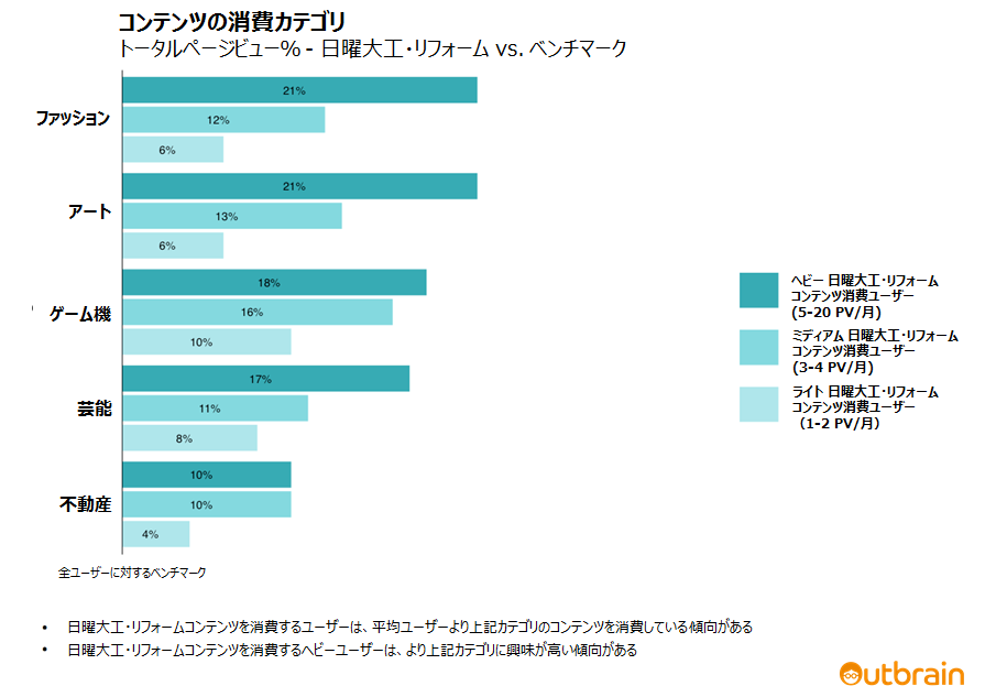 以下のグラフを例にしてみましょう。日曜大工や家のリフォームに関心のある人は、ファッション、アート、ゲーム機にも関心を示す傾向が強いことが分かります。