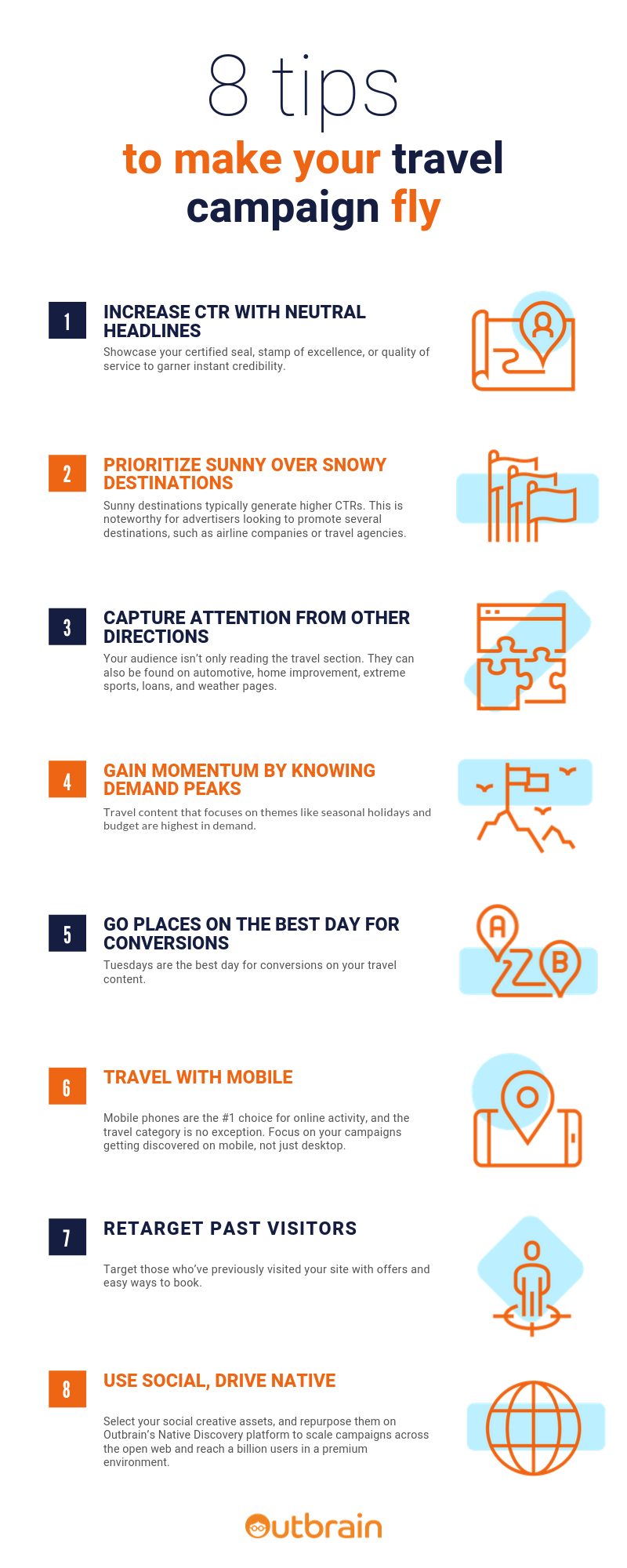 To get the most out of this format’s potential on the creative side, we’ve outlined 8 tips to help get your travel campaign off the ground and drive the consumer decision to purchase. These insights are inspired by current Outbrain data from 1 billion monthly ad impressions on the open web. Check out the infographic: