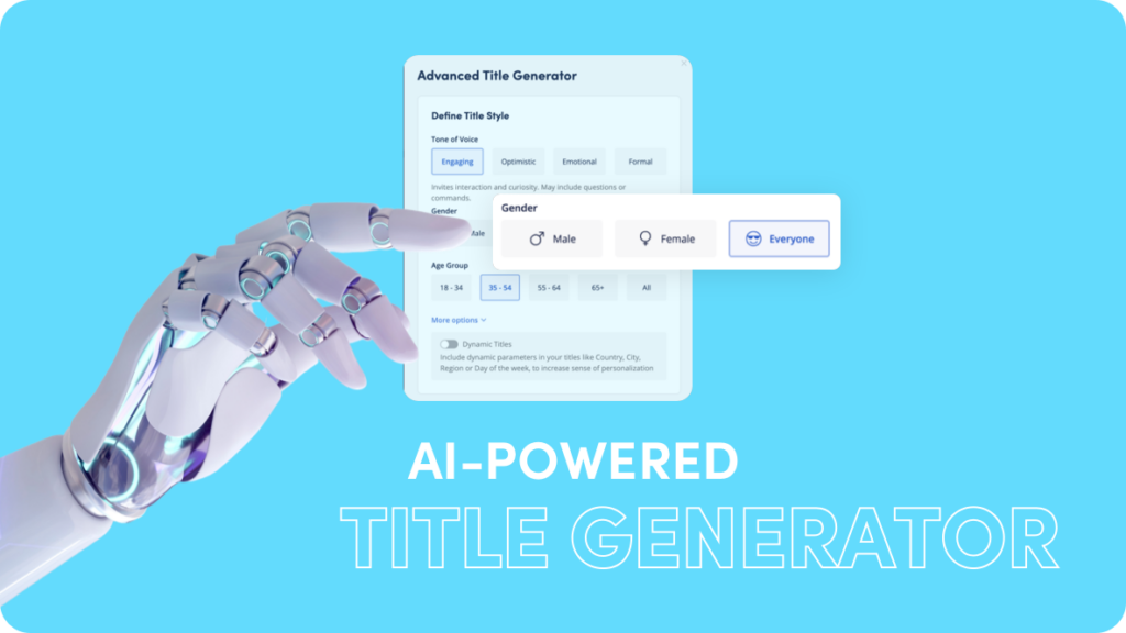 So, how does it work? The Advanced Title Generator goes beyond basic inputs like your original title and landing page. It leverages automated AI-based personalization, allowing you to tailor titles that resonate with your target audience. Select the tone of voice, gender, and age group to ensure your titles strike the right tone with your potential customers. But it doesn’t stop there—our tool also empowers you to include dynamic parameters, further enhancing the relevance and impact of your ad titles.
