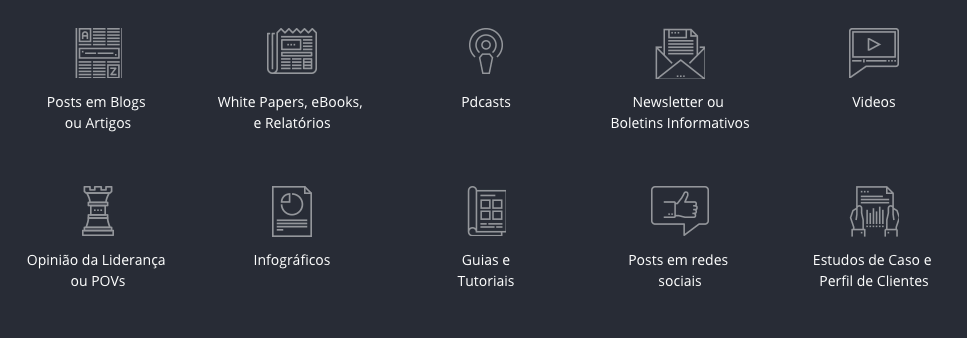 Há muitos tipos de conteúdo que você pode distribuir. De publicações de blog a estudos de caso, de infográficos a podcasts, de whitepapers a vídeos, sua estratégia de distribuição só é limitada pela sua imaginação.