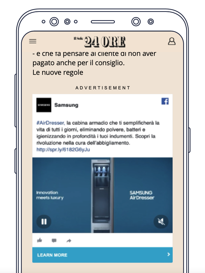 Samsung gehörte zu den ersten Werbekunden in Italien, die Native Social testeten, um die Awareness-Ziele zu erreichen. Native Social ist ein neues Anzeigenerlebnis innerhalb der Native-Awareness+- Suite von Outbrain. Native Awareness+ ermöglicht Marken wie Samsung, ihre Zielgruppen über aufmerksamkeitsstarke In-Article- Platzierungen zu erreichen.