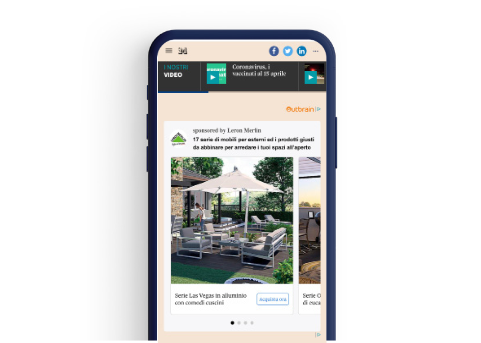 Carousel Smartad de Outbrain ayudó a Leroy Merlin a involucrar a un grupo de usuarios cualificados a través de múltiples creatividades y puntos de contacto que mostraban todas las posibles opciones de muebles de exterior, con titulares personalizados y llamadas a la acción. Esta experiencia publicitaria permitió a los usuarios informarse y comprometerse aún más con la marca a través de múltiples piezas de contenido.