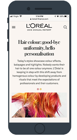 L‘Oréal publie chaque année son Rapport Annuel et en fait un véritable vecteur de communication. Ce support diffusé sur loreal-finance.com, initialement développé pour les actionnaires du groupe L‘Oréal, est aujourd‘hui un des principaux leviers de communication digitale du Groupe.