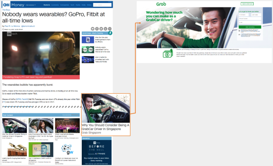 Outbrain used Grab’s Driver blog to create awareness. Over 30 images, headlines and source combinations allowed Outbrain’s algorithm to optimise towards the best results, with creative refreshed monthly. This drove effective mid-funnel prospecting in the form of quality leads. The Outbrain universal pixel was placed on the Grab driver recruitment landing page, activating custom audience collection and tracking conversions. Leads who started but not completed the action were also tracked through Outbrain’s Multiple Conversion feature.