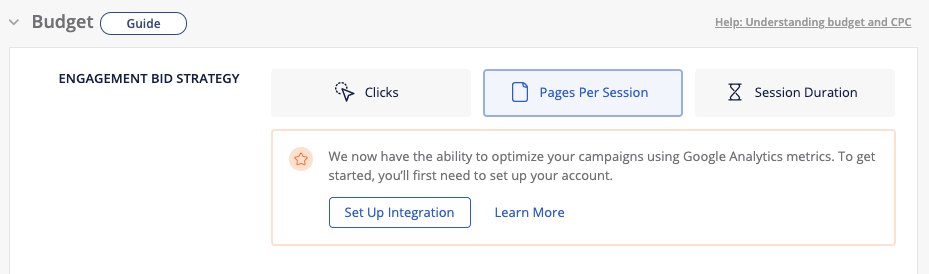 「Max pages per session」または「Max session duration」もしくは「Min bounce rate」モードを選択すると、Google Analyticsアカウントから抽出された対応するデータに基づいて、配信が最適化されます。この3つのモードのいずれかを選択すると、Google Analyticsデータを統合するよう求められます。
