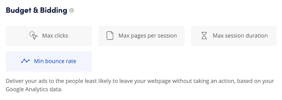 キャンペーン設定の際、まず最初にキャンペーンの目標を選択します。EBSは、目標に「Traffic」を選択した場合にのみ利用できます。クリエイティブフォーマットと配信先を選択いただくと、「Budget&Bidding」セクションが表示され、EBSの4つの異なるモード(Max clicks:クリック、Max pages per session:セッションあたりのページ数、Max session duration:セッション滞在時間、Min bounce rate:非直帰率)が表示されます。