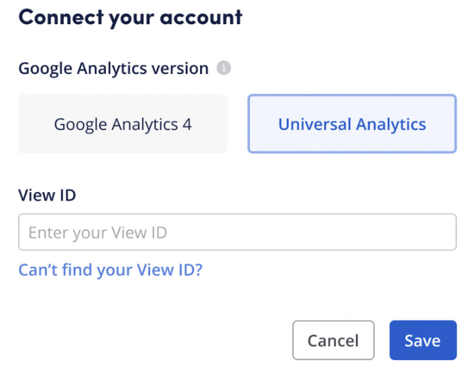 3、新しいポップアップが表示され、Property ID(GA4をご利用の場合)または、Google Analytics View ID(UAをご利用の場合)を入力するよう求められます。