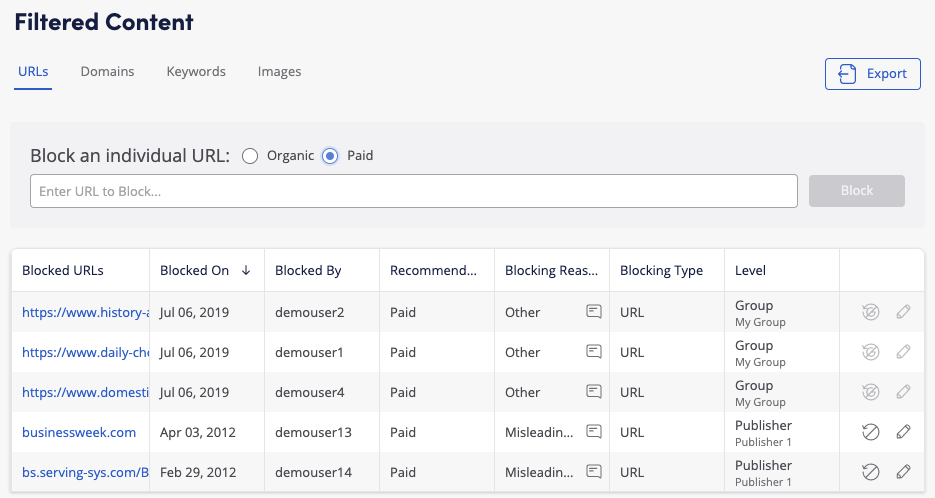 If you need to block in bulk (several URLs, Domains) or have any further concerns on blocking, please contact your account manager.